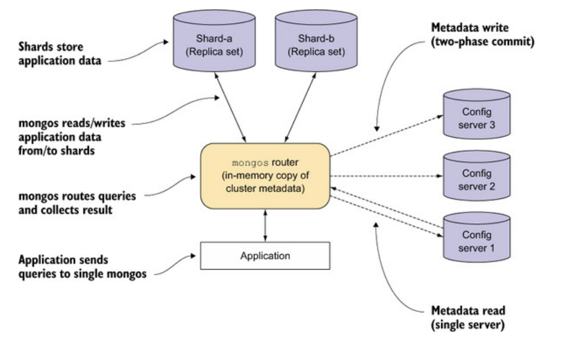 shards用来存储数据;只有mongos router可以直接连接shards,mongos router 缓存了cluster metadata 这样可以route write/read 到正确到的shard 上;config server 作用 - persist shard的 meta data